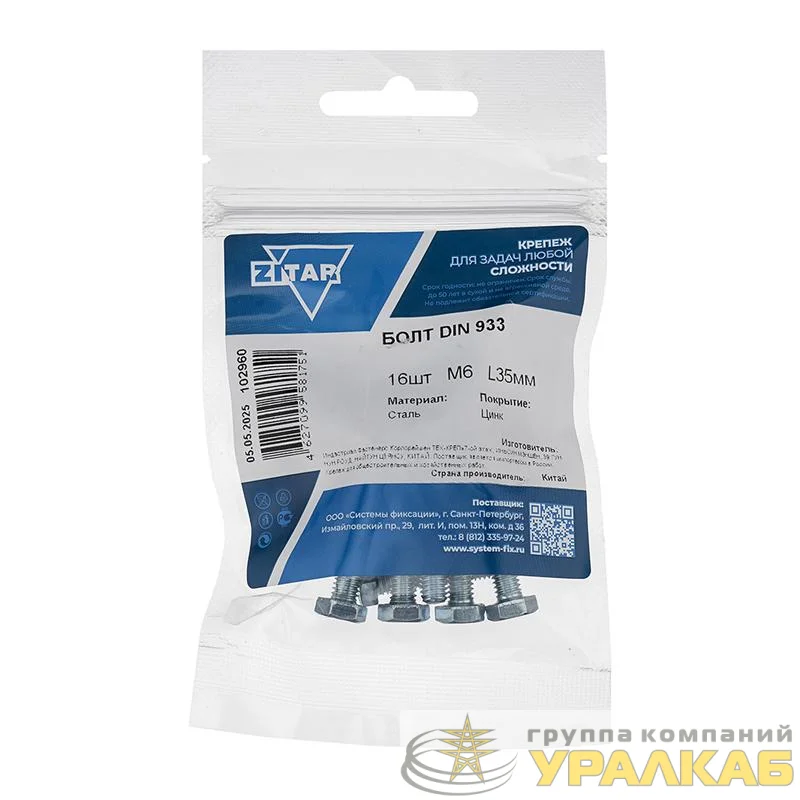 Болт с шестигранной головкой М6х35 DIN 933 оцинк. (уп.16шт) Tech-Krep/Zitar 102960