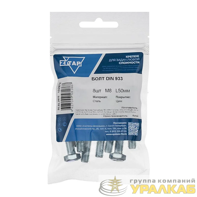 Болт с шестигранной головкой М8х50 DIN 933 оцинк. (уп.8шт) Tech-Krep/Zitar 102972