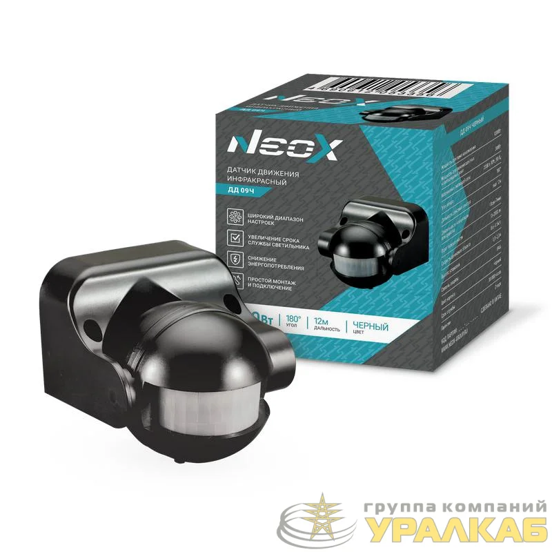 4690612053356 - Датчик движения инфракрасный ДД 09Ч 1200Вт 180град. 12м IP44 черн. NEOX