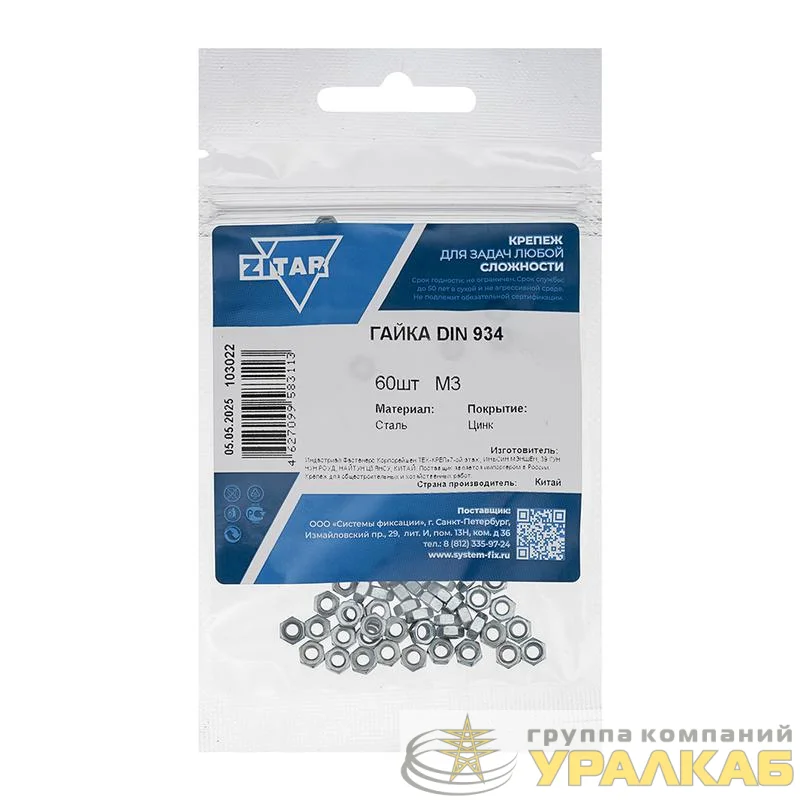 Гайка шестигранная М3 DIN 934 оцинк. (уп.60шт) Tech-Krep/Zitar 103022
