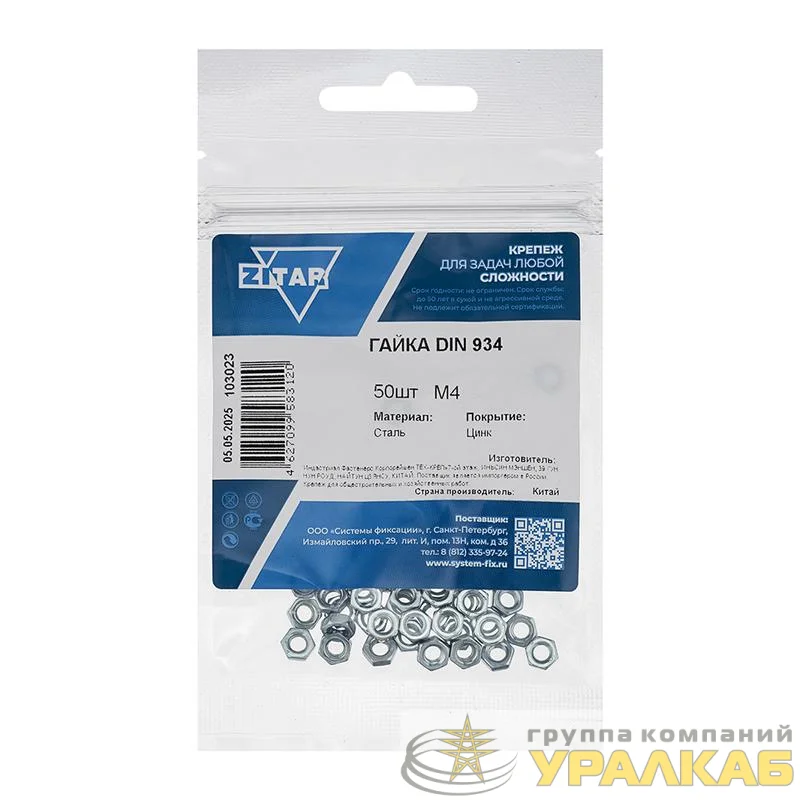 103023 - Гайка шестигранная М4 DIN 934 цинк. (пакет) (уп.50шт) Zitar