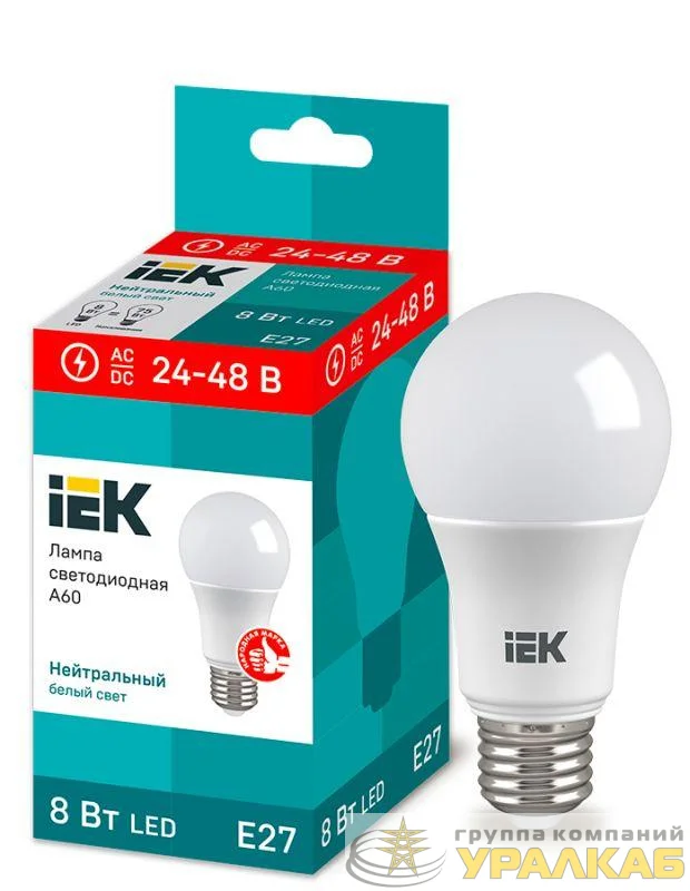 Лампа светодиодная 8Вт A60 грушевидная 4000К нейтр. бел. E27 24-48В низковольтная IEK LLE-A60-08-24-48-40-E27