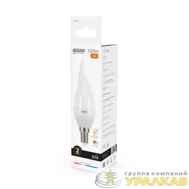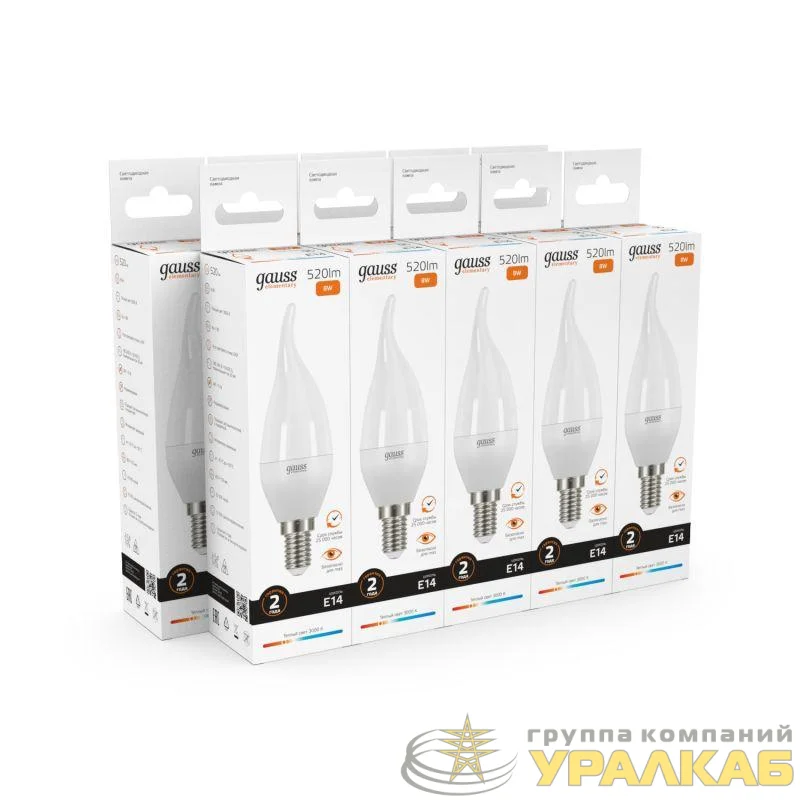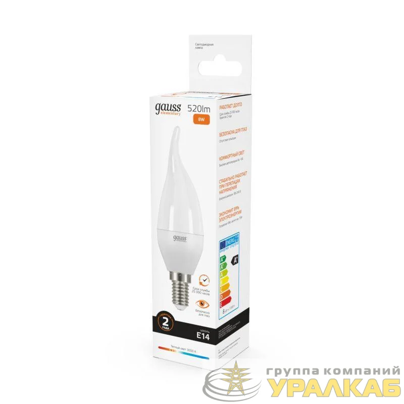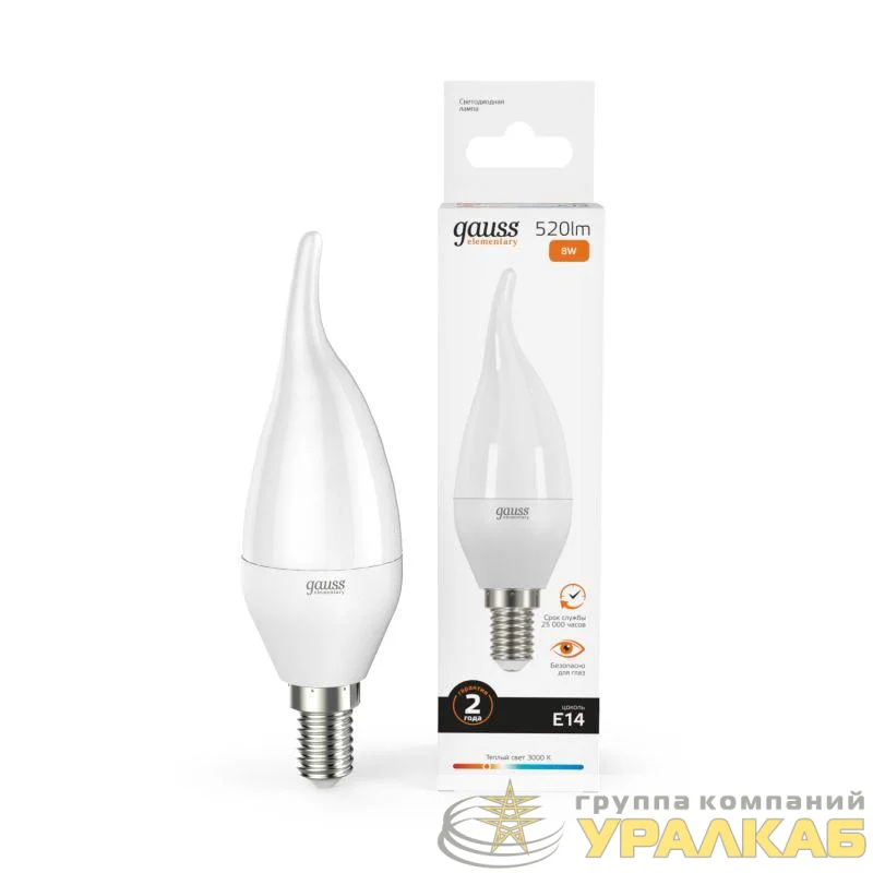 34118 - Лампа светодиодная Elementary 8Вт свеча на ветру 3000К тепл. бел. E14 520лм GAUSS