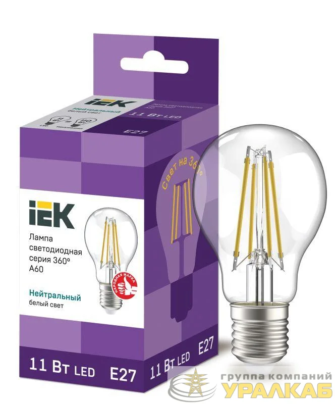 Лампа светодиодная филаментная 360° 11Вт A60 грушевидная прозрачная 4000К нейтр. бел. E27 230В IEK LLF-A60-11-230-40-E27-CL