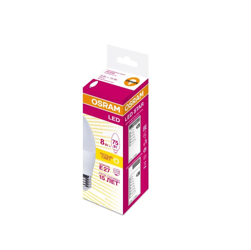 Лампа светодиодная LED STAR CLASSIC B 75 8W/830 8Вт свеча 3000К тепл. бел. E27 806лм 220-240В матов. пласт. OSRAM 4058075210745
