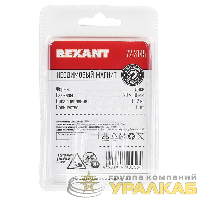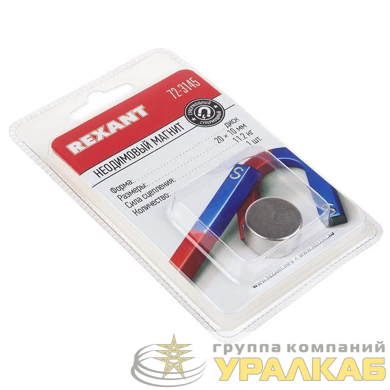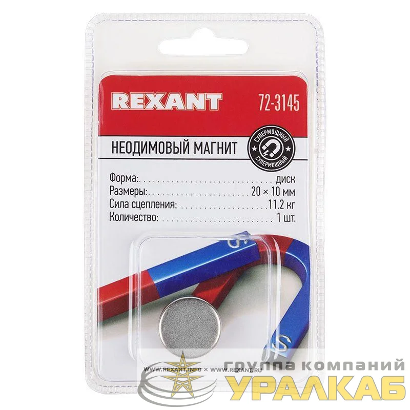 Магнит неодимовый диск 20х10мм сцепление 11.2кг (блист.) Rexant 72-3145