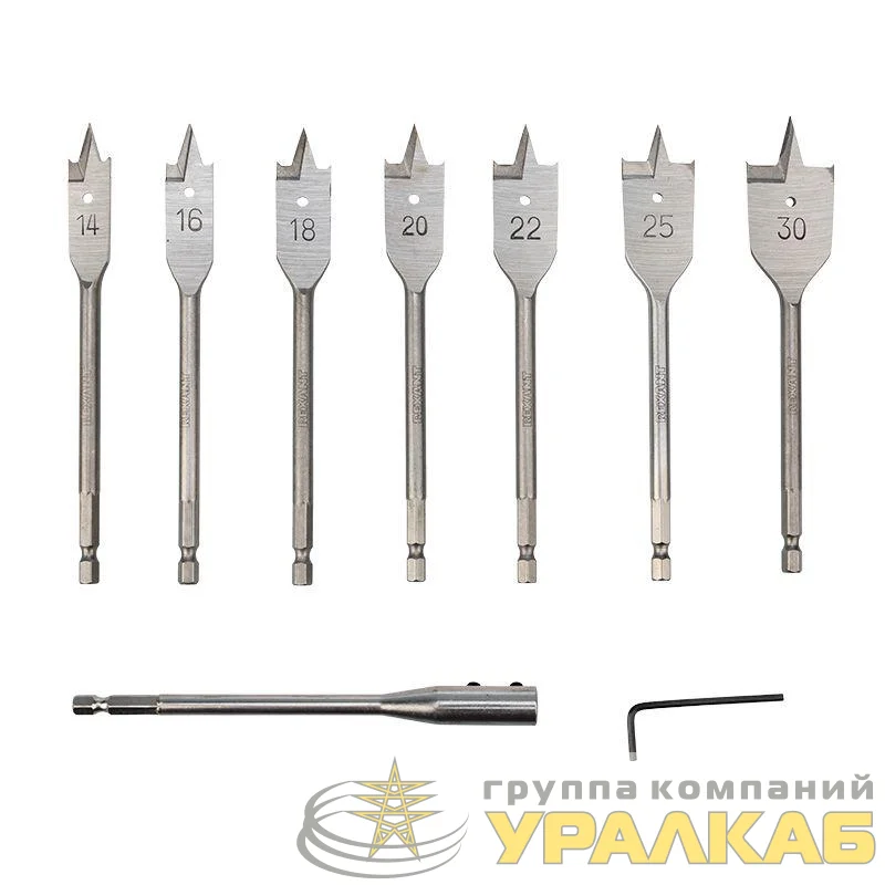Набор состоит из перовых сверл диаметром 14-16-18-20-22-25-30х152 мм (7 шт.), удлинителя и углового ключа.
