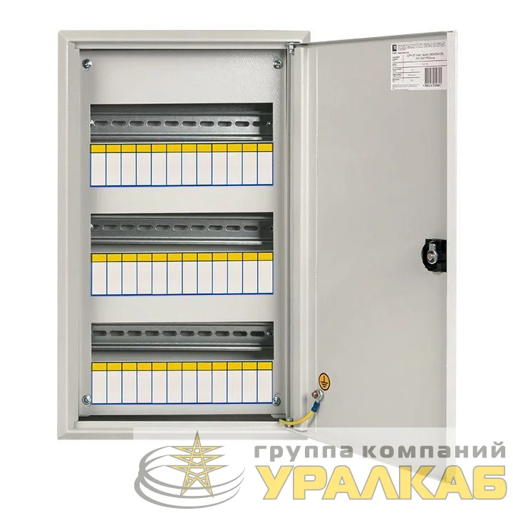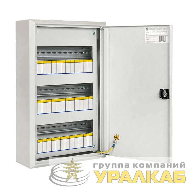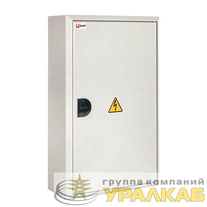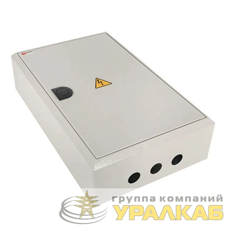 Навесной, с дверцей и замком. Изготовлен из металлического сплава, серого цвета. Размеры: 480 х 120 х 300 мм. Защищен от проникновения пыли и вертикальных капель (IP31).