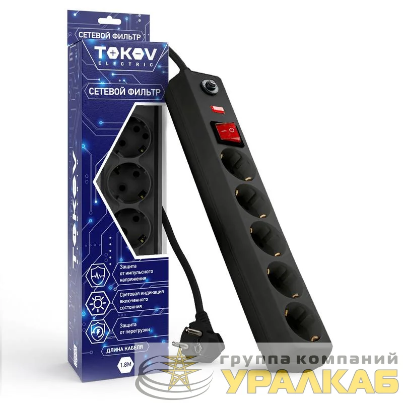 Удлинитель с сетевым фильтром 5х1.8м с заземл. с выкл. 16А с защ. от скачков напр. и перегрузок 3х1 черн. TOKOV ELECTRIC TKE-C05-SF5-1.8-ZV