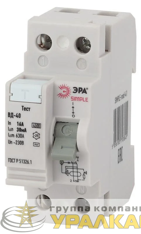 Б0039268 - Выключатель дифференциального тока (УЗО) 2п 63А/100мА ВД-40 (электронное) SIMPLE-mod-48 ЭРА